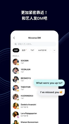 Weverse为您打造身临其境的实时互动体验。通过引人入胜的Weverse LIVE,您可以与最爱的艺人共同度过精彩的直播时光,即时发送文字聊天,并用点赞表达您的热情与支持。更独具匠心的是,Weverse的Listening Party将音乐的魅力与社群的温暖完美融合,无论是艺人发起的官方派对,还是粉丝间的专属聚会,都能让您与同好乃至艺人本人,一同沉浸在音乐的海洋中,共享这份由旋律编织而成的独特共鸣。若渴望更私密的交流,Weverse DM则为您提供了与艺人直接对话的专属通道,通过订阅即可解锁这份心照不宣的亲密。